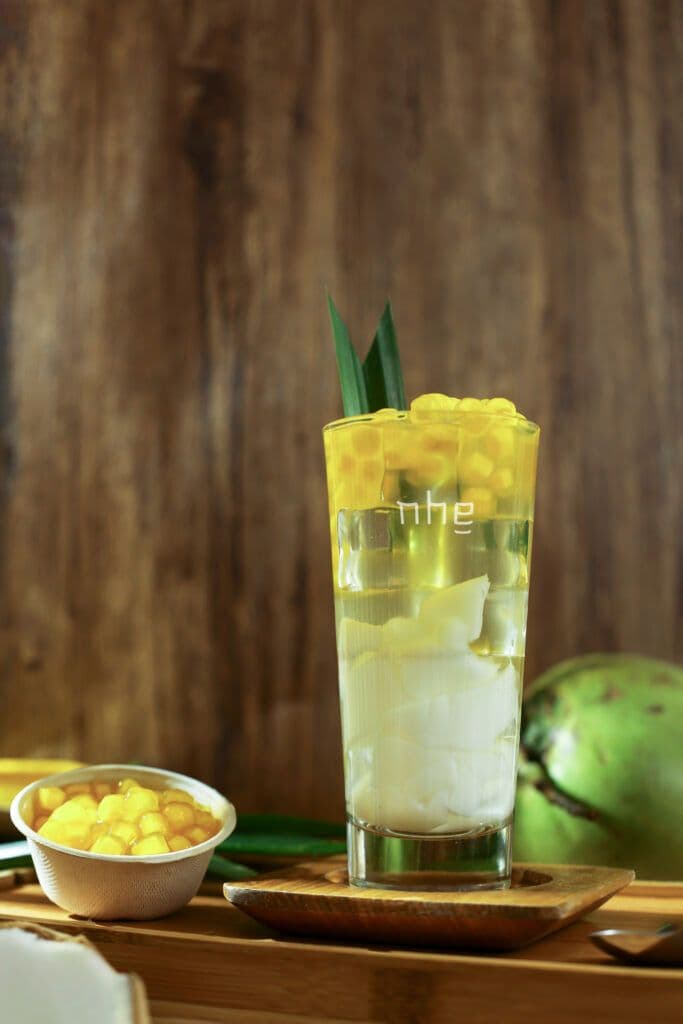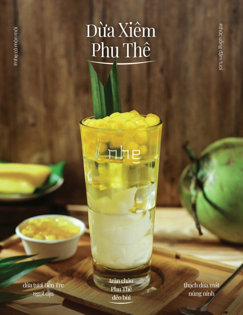 Vị ngọt thanh mát của Dừa Xiêm Bến Tre, kết hợp cùng vị bùi bùi của nhân dừa nếp, gói trọn trong lớp vỏ đậu xanh vàng óng của Trân Châu Phu Thê Kinh Bắc, sẽ đưa bạn vào một hành trình vị giác đầy bất ngờ. Từng ngụm nước dừa tươi mát hòa cùng trân châu dai bùi, như một sự kết nối tinh tế giữa hương vị miền Nam và miền Bắc – từ sông Mekong đến vùng đất Kinh Bắc xa xôi.